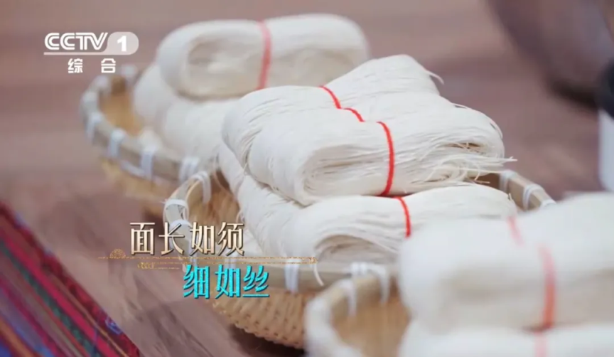 拉福州线面,不仅是体力活,拉面方法也有讲究。一拉一扬,一进一退,力道太轻拉不长,力道太重容易断。拉好的细面丝细如发,柔软且韧。新年来上一碗线面,欢欢喜喜迎福气!